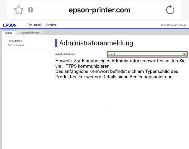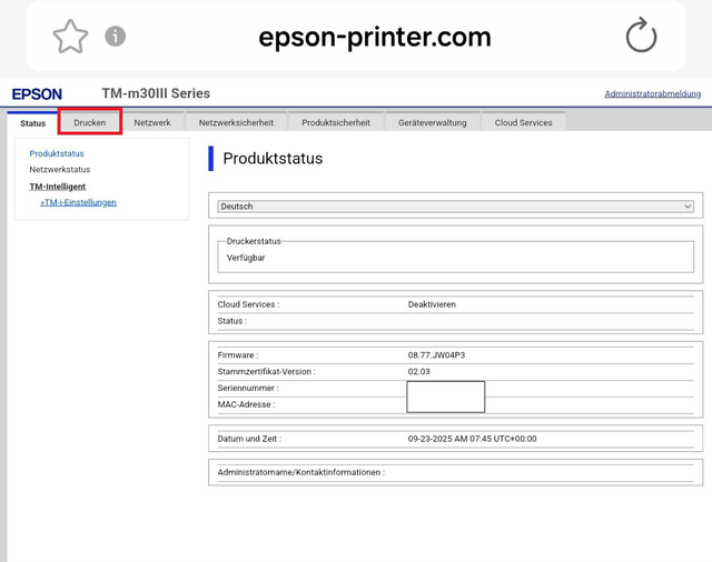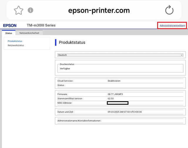 - Mit der Administrator-Anmeldung anmelden (Passwort auf der Rückseite des Druckers unter der Abdeckung).